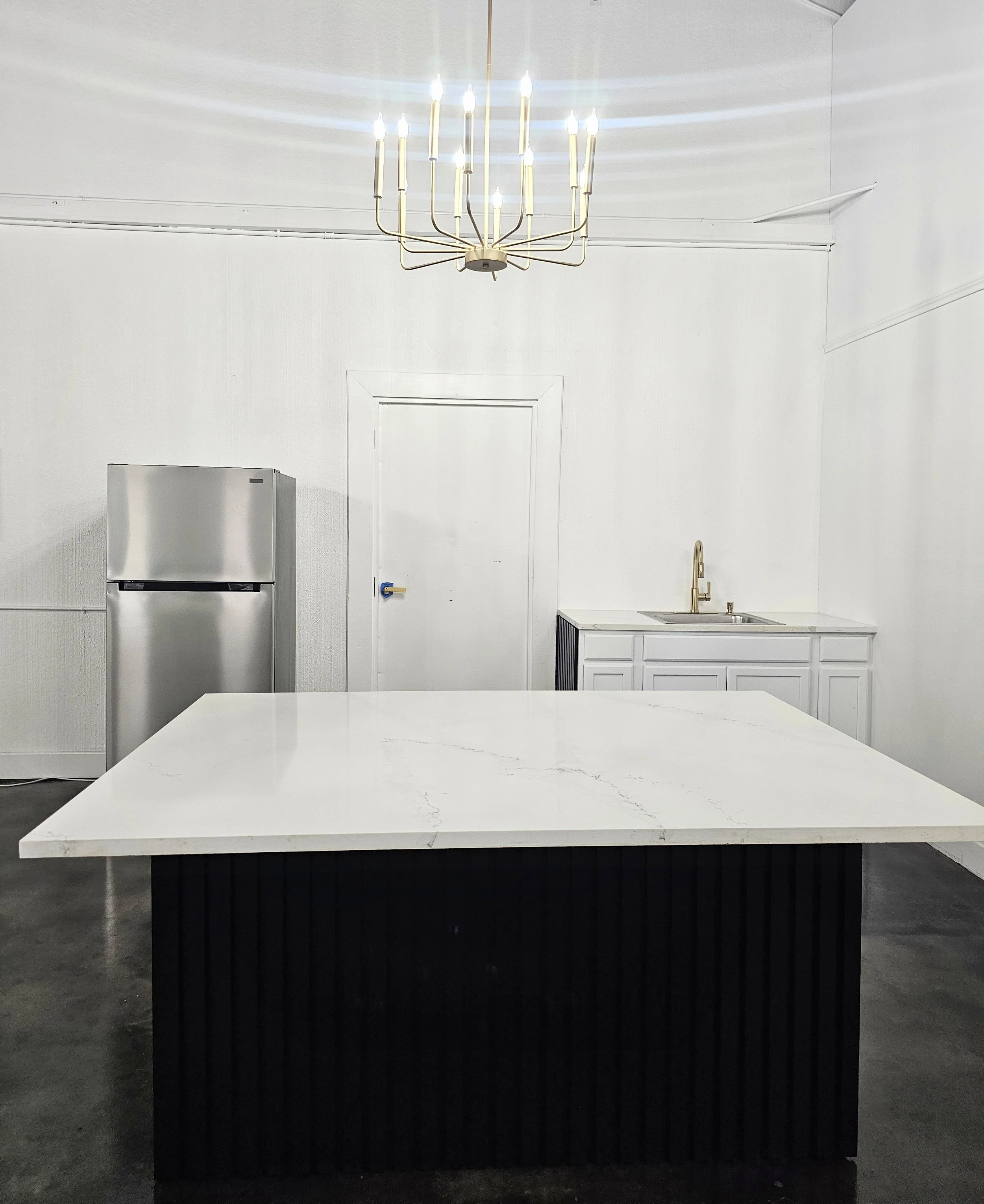 Our 6’x4’ granite kitchen island is the perfect place to put your food and cake along with a sink, refrigerator, freezer and microwave.